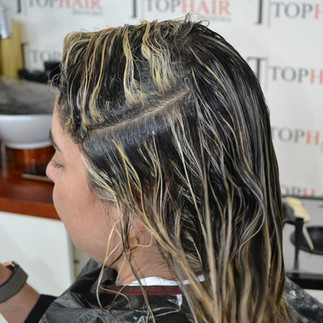 Foi executada a técnica em zigue zague, com leve diagonal para cabelos cacheados, eriçando algumas mechas selecionadas, para que as pontas ficassem mais loiras, mas sem perder o contrate. Todo topo também foi feito em zigue zague, porém em menor espaçamento. A divisão foi feita em forma de livro (no meio), e foi feito um contorno em toda frontal e nuca na técnica de transparência "sem selecionar mechas”.