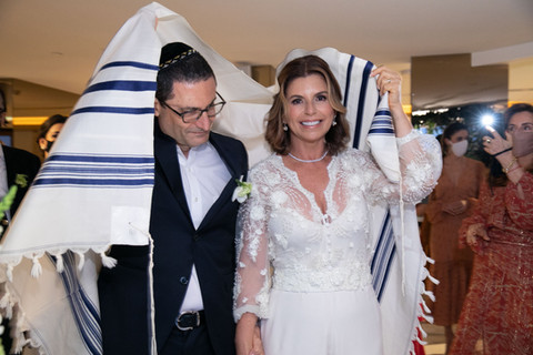 Reunião familiar com poucos amigos, unindo famílias de origem judaica e católica. A cerimônia foi marcada por 3 celebrações: Maria Vitoria juíza de paz, fez o casamento civil; Padre Jorjão deu uma benção ao casal, com a ajuda da mãe de Raquel, a Cleuba Verri que também fez sua homenagem; e, por fim, a celebração judaica feita pelo filho do Henrique, Victor Szapiro. Tudo diante de uma exuberante vista para o mar com direito a uma enorme Lua.