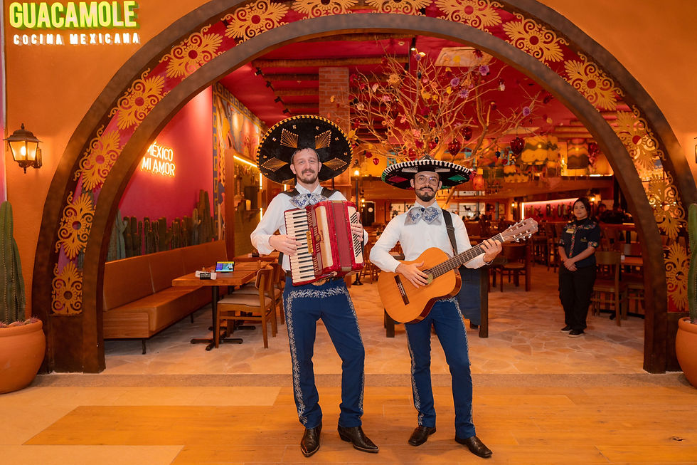 A energia da casa é elevada pelos Mariachis. Com trajes típicos bordados, eles circulam tocando de tudo — dos clássicos mexicanos aos hits internacionais.
